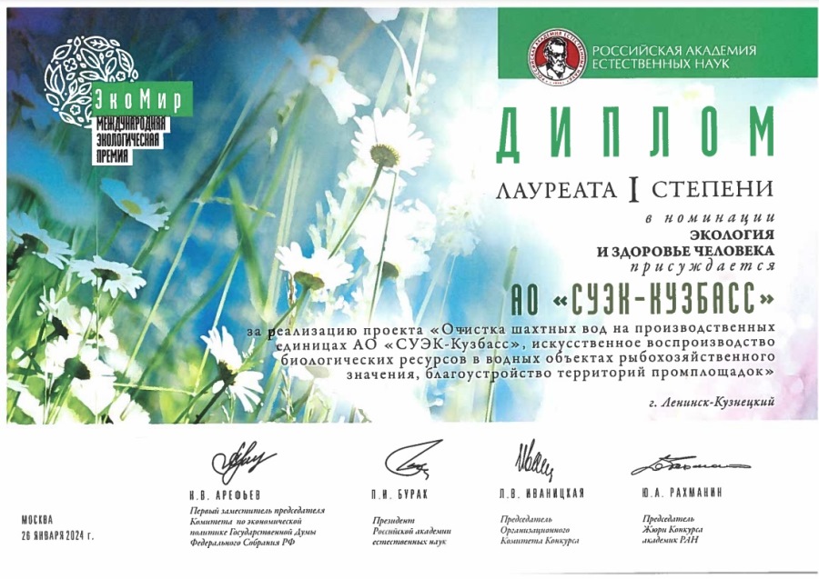Проект по очистке шахтных вод, реализованный на угледобывающих предприятиях АО «СУЭК-Кузбасс», стал обладателем диплома 1 степени Международного экологического конкурса «ЭкоМир – 2023», организатором которого выступает Российская академия естественных наук. |
